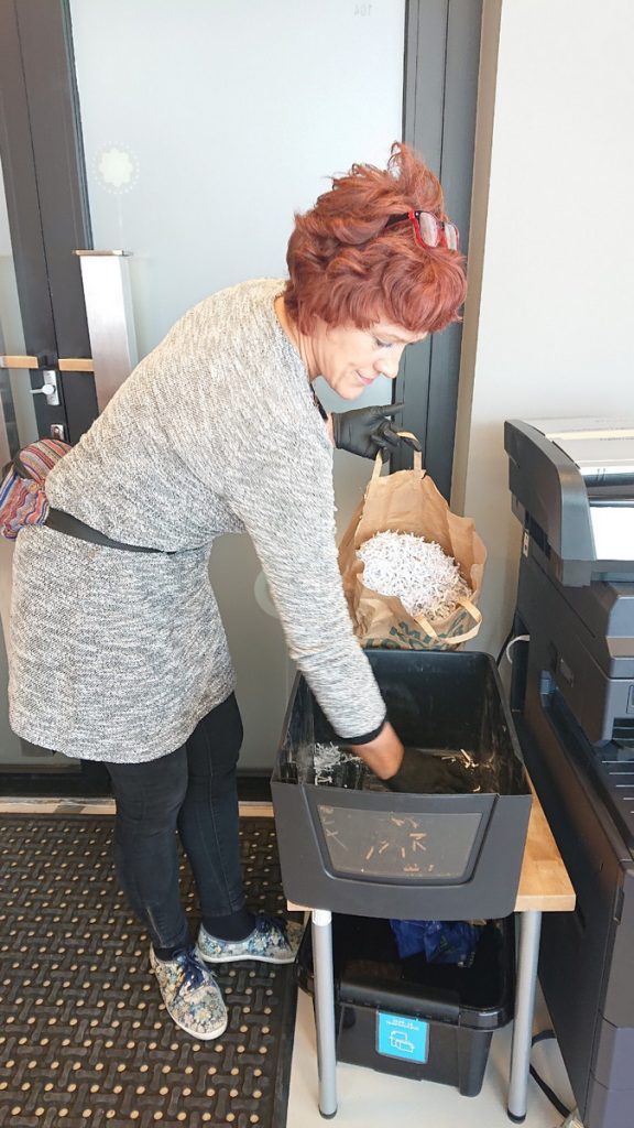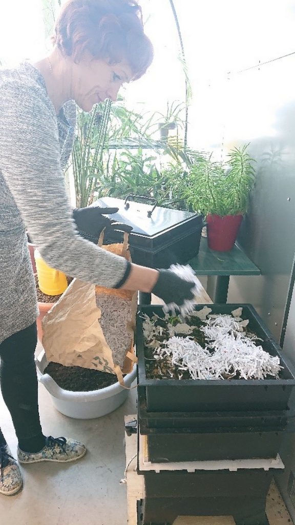 Loodusmaja aednik Piia, kes hoolitseb ka Vermikomposteri eest, viib elanikele järjekordselt paberimassi.